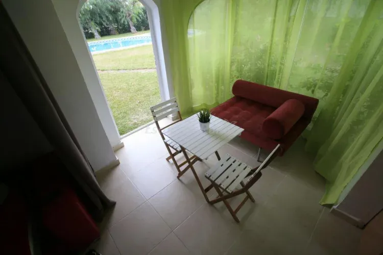 Consta de 1 habitación de matrimonio, 1 baño, cocina, salón comedor con sofá cama (de apertura italiana y con colchón viscolástico 135 x 200), terraza acristalada, muebles de jardín y barbacoa.