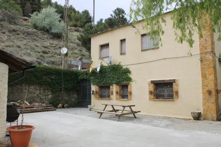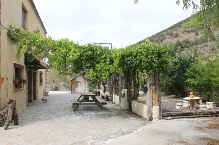 La casa tiene una parcela cerrada donde aparcar los vehículos, con barbacoa exterior y mesas para comer a la sombra de as parras.