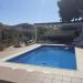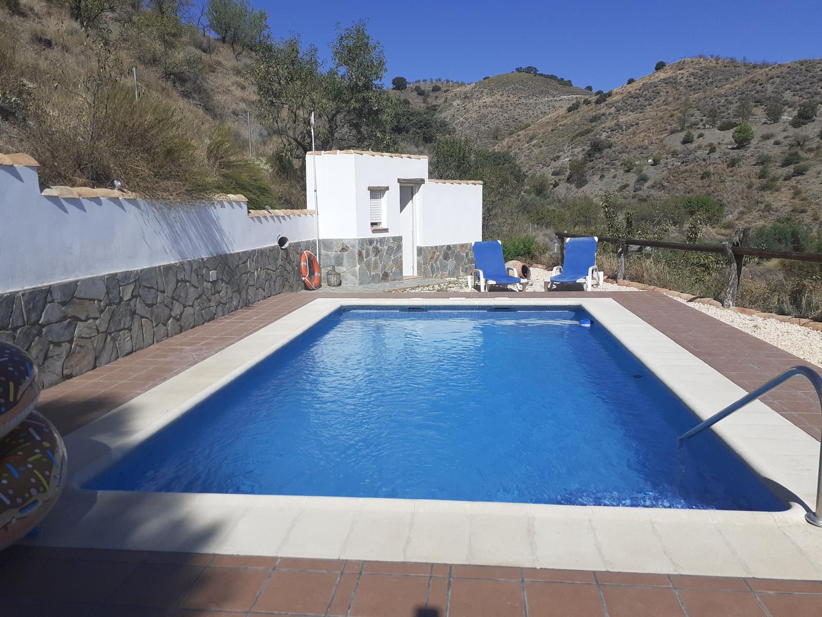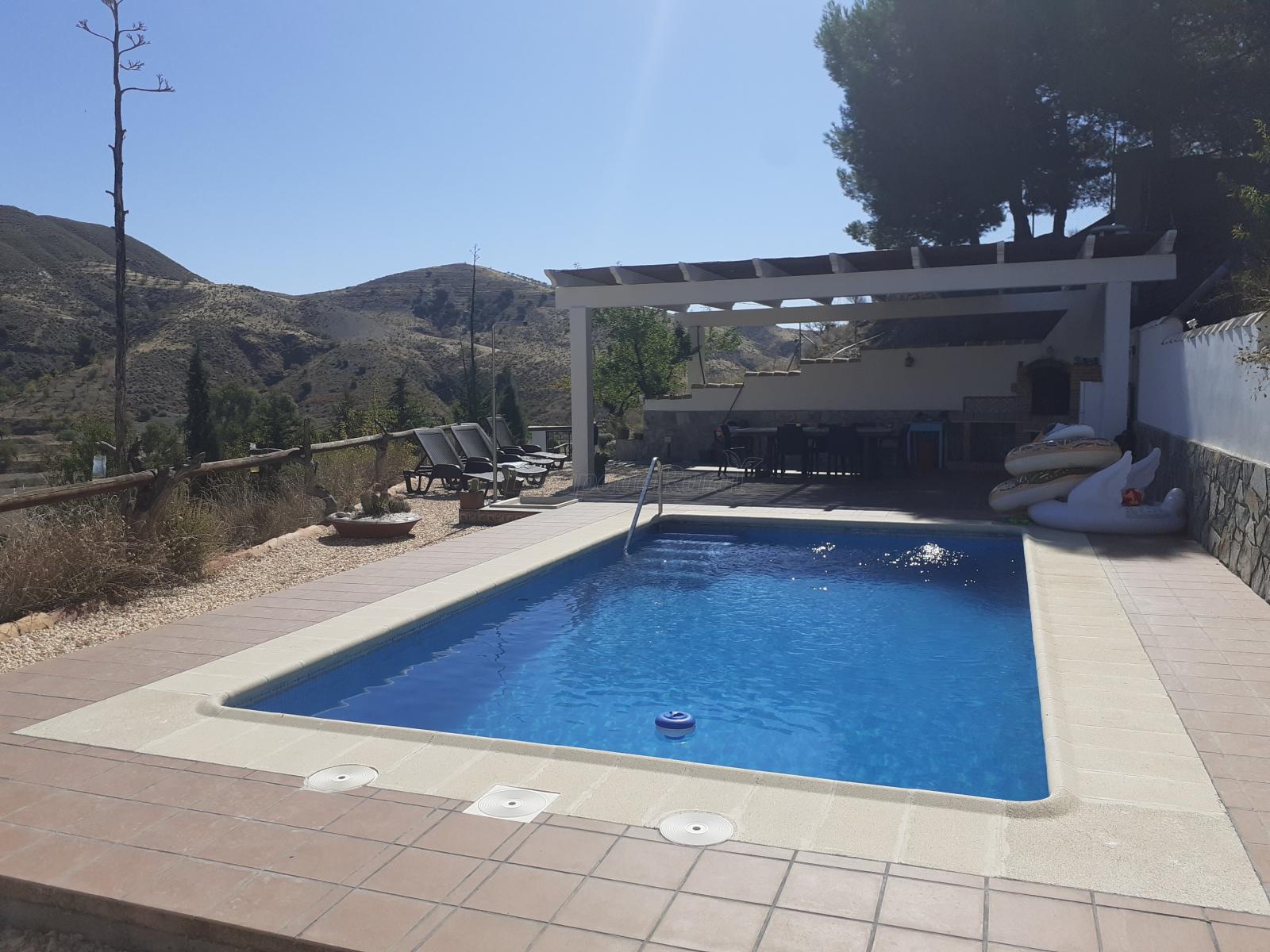 En la zona de la piscina hay barbacoa, baño, nevera y mesa con sillas.