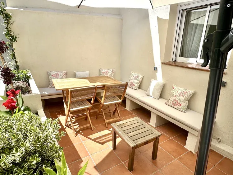 Desde el salón accedemos a un precioso patio, con mucha intimidad, decorado con plantas y con una mesa de comedor y dos tumbonas para disfrutar del relax.