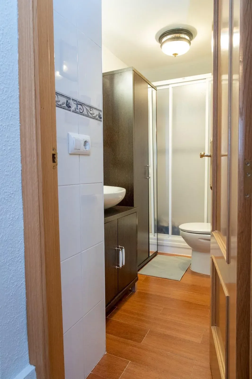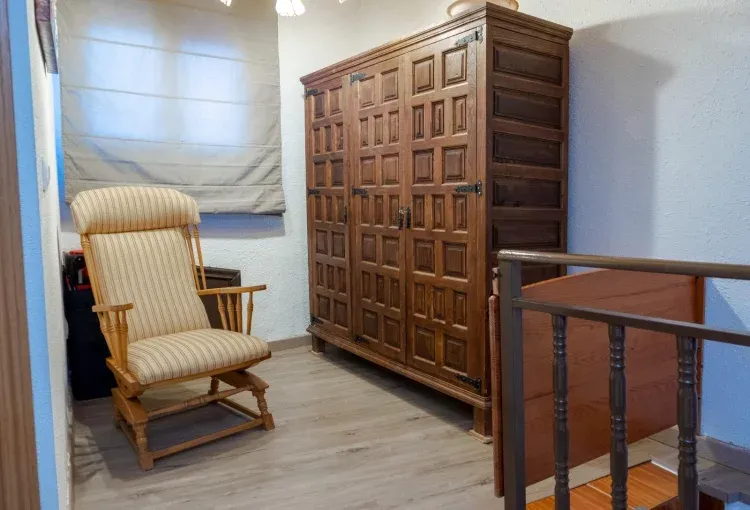 La primera planta cuenta con un baño completo con plato de ducha y dos habitaciones, una de ellas con cama de matrimonio y la otra habitación, que da acceso a la buhardilla, se puede usar de día también como sala de estar con un diván convertible en cama doble con televisión Smart Tv y aire acondicionado de calor y frío. También dispone de un pequeño balcón con vistas a la Sierra de Gredos.