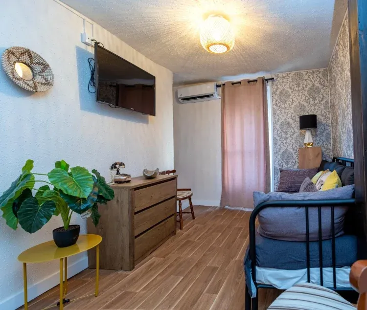 En la planta alta, una preciosa habitación abuhardillada de techos de madera con aseo propio, cama doble de 1,80 con televisión Smart TV y aire acondicionado de frío y calor.