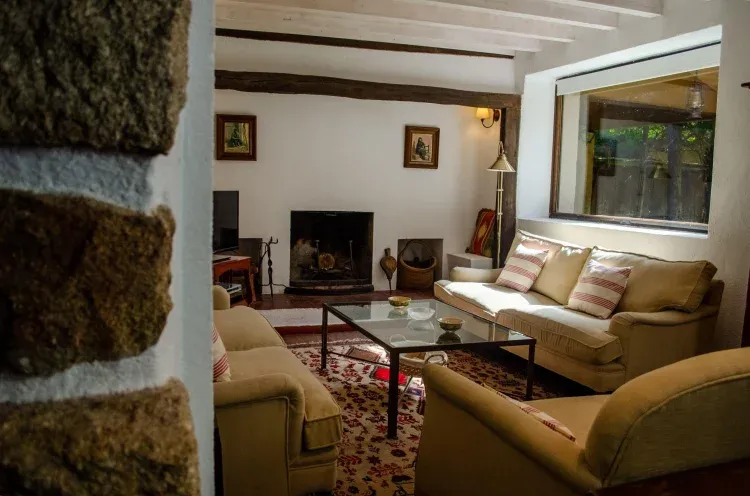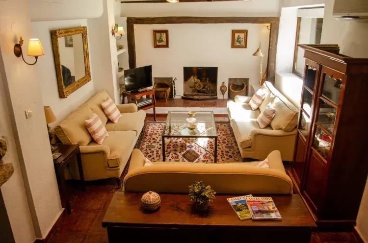 En el salón se encuentra la chimenea de leña, tv pantalla plana, zona de sofás, vistas al jardín y salida directa al mismo dotado de piscina privada y barbacoa. La casa cuenta con calefacción y aire acondicionado.