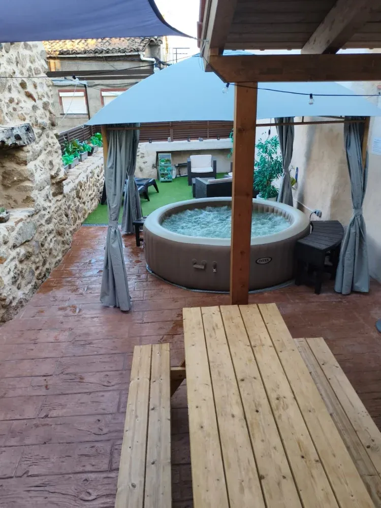 En el exterior hay un patio de uso particular con una gran barbaoca, una bonita y acogedoras zona de jardin y un spa con agua caliente para relajarse despues de una día de ruta o de excursiones.