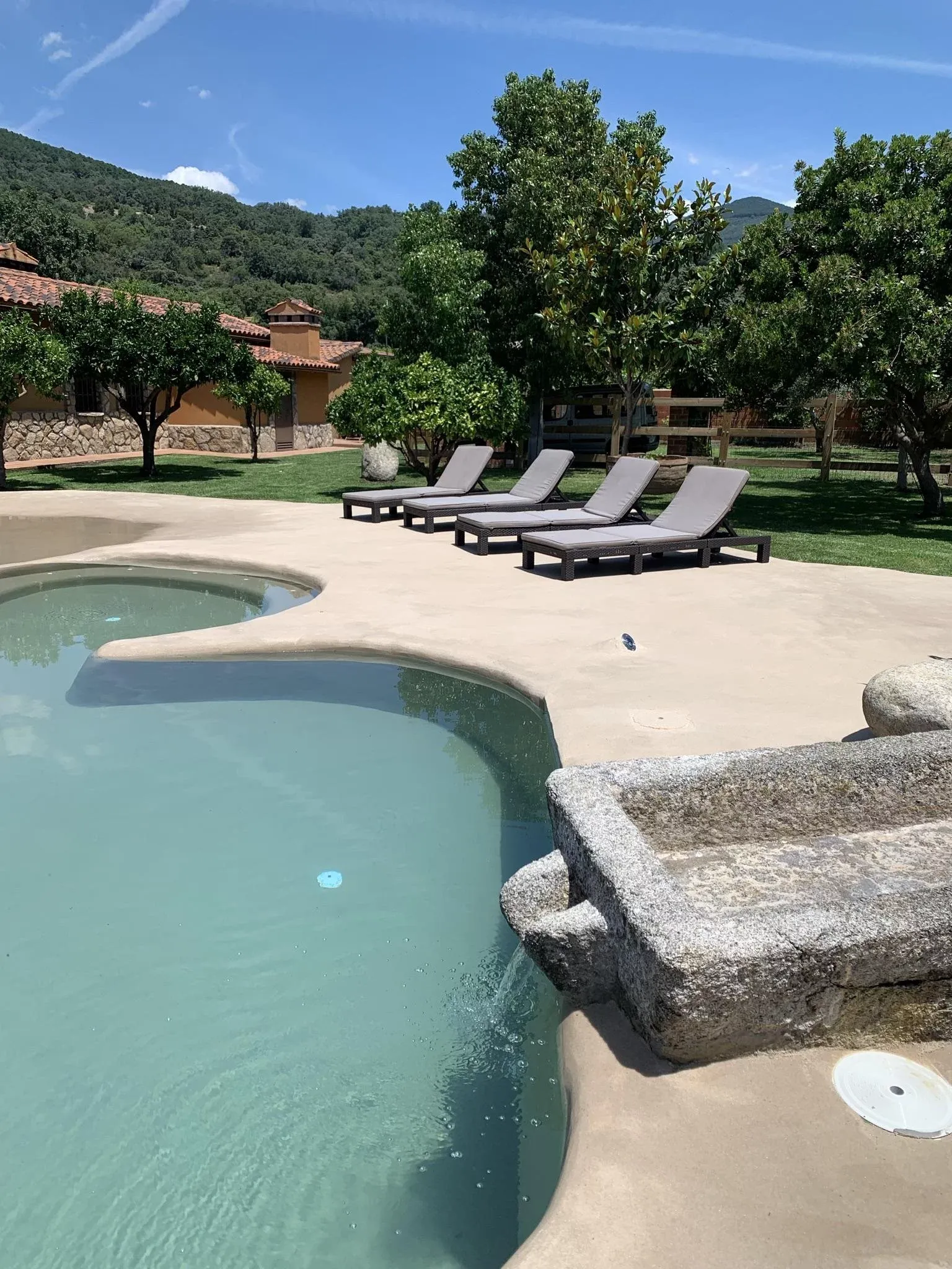 En el exterior disponemos de un patio de unos 70 m2, amplia zona de jardín de más de 2000 m2 con muchos árboles, tres cenadores, uno que es la zona chill out pegado a la piscina, otro que tiene una barbacoa de obra con zona para preparar, mesa para 15 personas, barra con cámara para bebidas cerca de la piscina. Y el otro cenador, en la parte de la cocina, con mesa alta y espacio para 15 personas.
