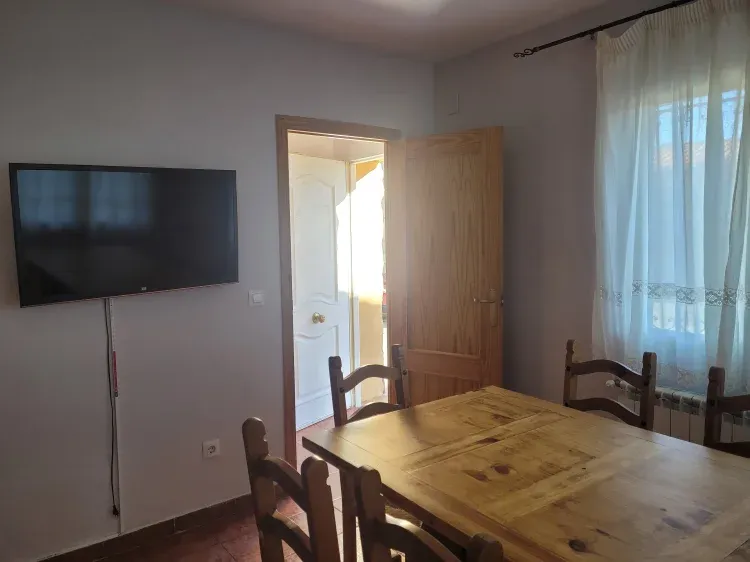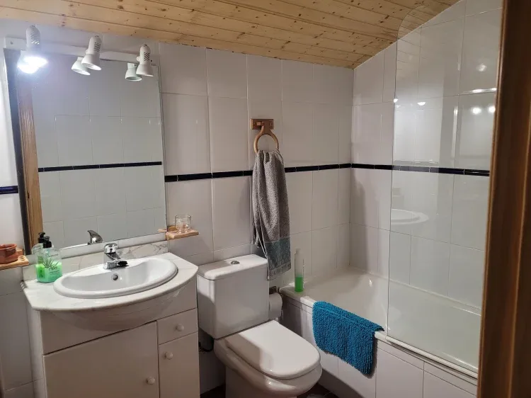 En planta alta tiene una suite con cama de matrimonio de 1,50 y salita de estar con televisión, otra habitación con dos camas dobles, sofá y televisión, y otra de matrimonio, más otros dos baños completos. La casa tiene barbacoa en un patio cerrado.