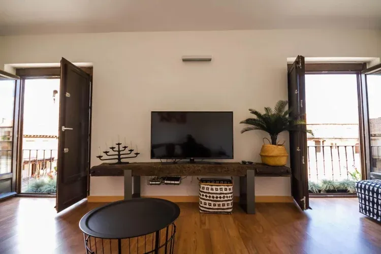 Consta de un salón moderno, amplio y luminoso con dos puertas de acceso, una desde la cocina, cuenta con sofá de tres plazas, más otro sofá cama de dos plazas con posibilidad de convertirse en cama de 1,40. Mesa de comedor con modernas sillas. Smart TV DE 50’pulgadas 2 balcones con unas impresionantes vistas a la Plaza de la Villa. Aire acondicionado