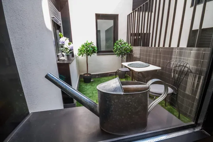 En el exterior podrás disfrutar de una amplia terraza a la que se accede desde las dos habitaciones principales, con mesa, dos sillas y un pequeño banco con mesita baja y un pequeño patio al que se accede desde la cocina, da al apartamento una luminosidad especial que hace que entre luz por varias estancias, cuenta con mesa, dos sillas y tendedero.