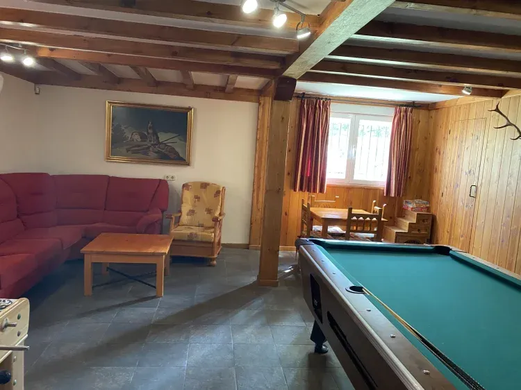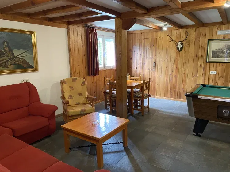 La acogedora casa se divide en dos plantas con 5 habitaciones, 3 baños, salón con chimenea, sala de juegos en planta baja, billar, futbolín, diana y juegos de mesa.