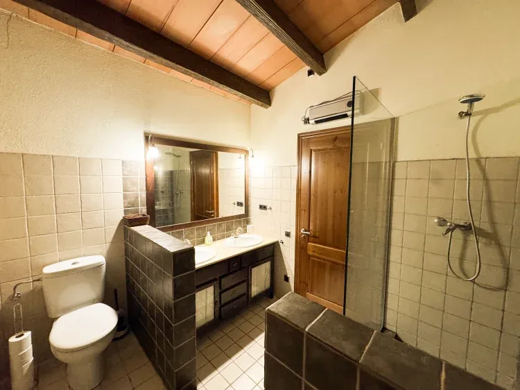 En la planta primera disponemos de 3 habitaciones dobles, cada una con una cama de matrimonio, y un par de camas individuales adicionales en cada habitación, permitiendo alojar cómodamente a tres familias de 2 adultos y 2 niños. De manera excepcional, se puede añadir una cama supletoria para mayor flexibilidad. En la planta superior también encontrarás 2 baños completos con ducha, con toallas, secador de pelo, champú y gel de baño..