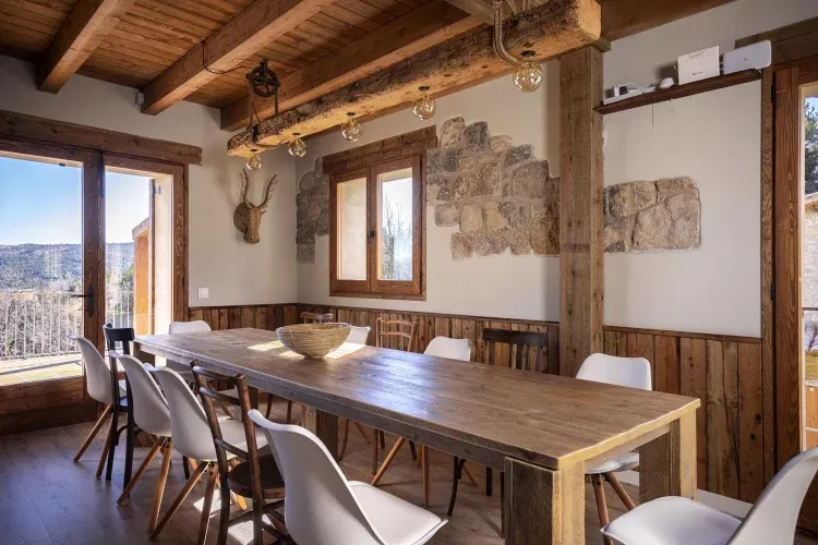 En la Masía se ubican en sus tres plantas; tres habitaciones todas ellas con vistas exteriores y baño incorporado. Una cocina-comedor con sala de estar y acceso a la amplia terraza con vistas a la Sierra del Cadí, la Tossa de Alp y el Puigmal al fondo. Y la sala de juegos con acceso a la barbacoa cubierta.