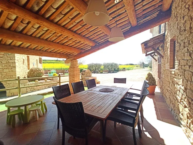 • Barbacoa, porche i jardín, sofá exterior, hamaca y otro mobiliario de jardín. La barbacoa, cubierta, está construida dentro de una antigua tina de vino, con lo que si llueve o hace mucho sol, se puede hacer igualmente.