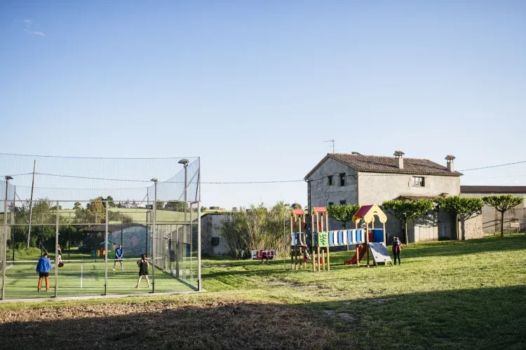 En el exterior de la casa, piscina totalmente rodeada de naturaleza, pista de pàdel privada y parque infantil.