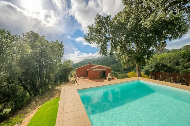 En su exterior una amplia zona de bosque vallada y una piscina con solarium y Barbacoa.