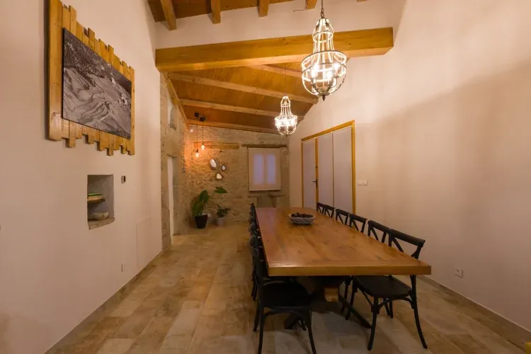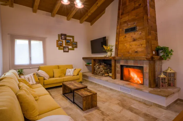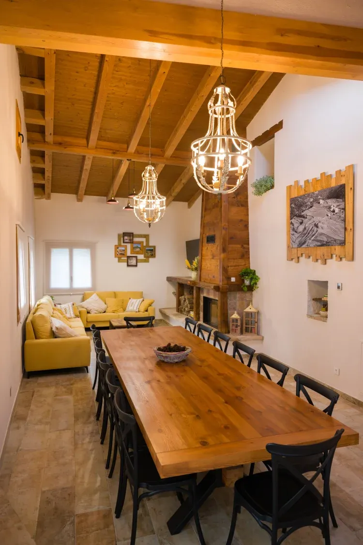 ● Comedor con chimenea y una gran mesa de madera para las comidas en el interior.