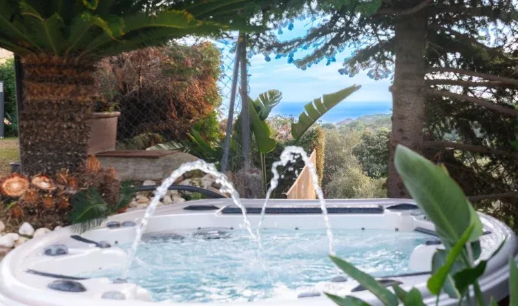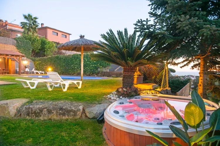 La villa tiene una gran piscina privada, y jacuzzi para 6 personas sobre un jardín llano muy bien cuidado con vistas al mar y montaña con tumbonas para tomar el sol y todo lo necesario para relajarse y disfrutar de unas buenas vacaciones.