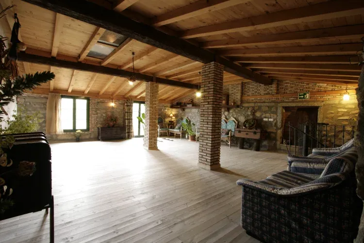 El segundo salón también muy espacioso y con estética rural (suelos de madera, muros de piedra...) se encuentra en la segunda planta acompañado de las habitaciones.