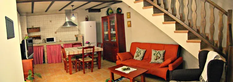Dispone de dos habitaciones, una con dos camas individuales y la otra de matrimonio, cuarto de baño, salón cocina-comedor con chimenea además de todo el menaje necesario y un sofá cama.
