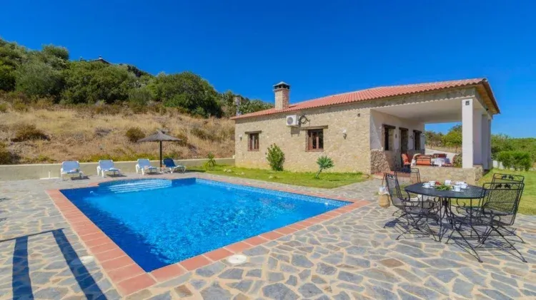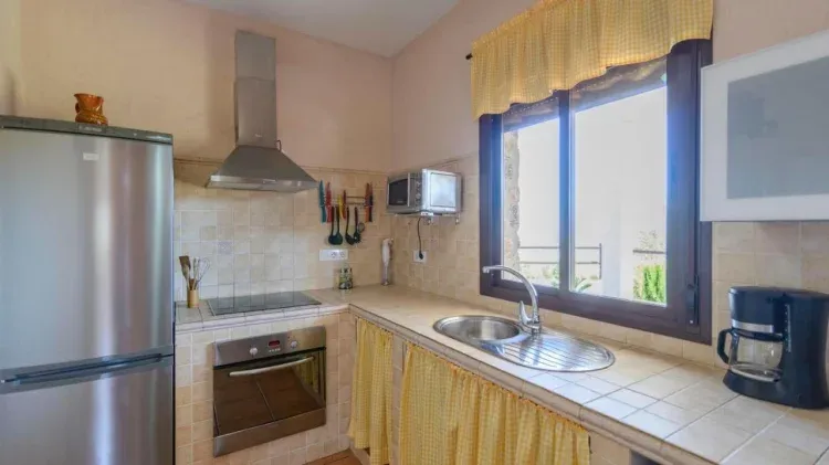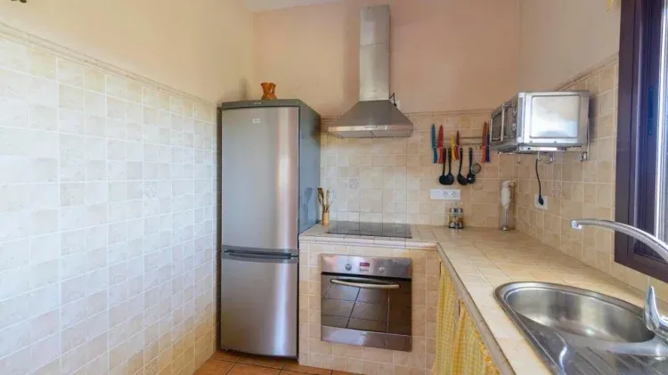 Parcela de unos 9000 m2, está distribuida en una sola planta y dispone de tres dormitorios, uno con cama de matrimonio y los otros dos con dos camas individuales cada uno; un baño completo; un salón - comedor con chimenea y una cocina totalmente equipada, abierta al salón. En la zona exterior cuenta con un porche, piscina privada y barbacoa.