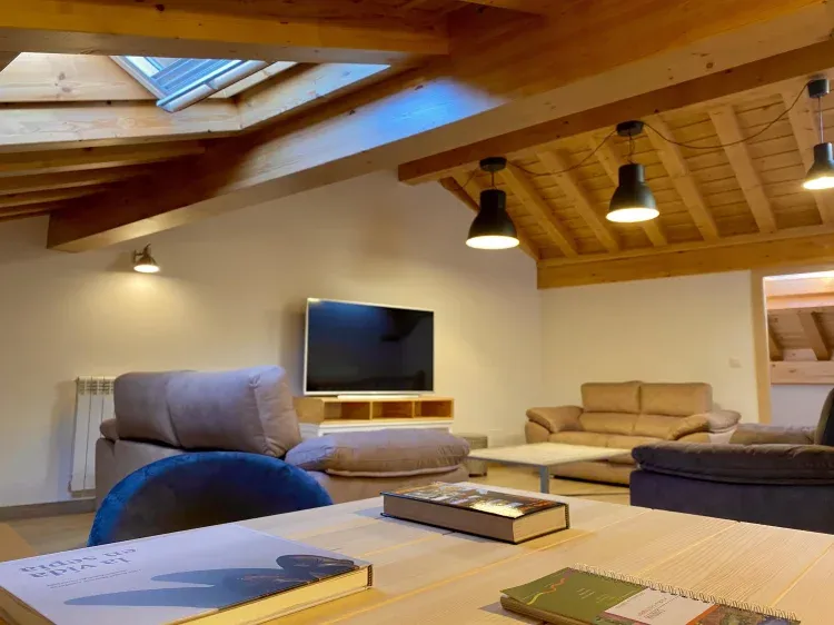Casa fantástica que tiene 9 habitaciones con baño lo que es un lujo. Además camas cómodas muy cómodas. En la parte baja hay dos cocinas, comedor y 2 habitaciones. La parte exterior es un lujo, con barbacoas, chimenea y zonas de mesas donde poder comer y los niños jueguen. Tiene un salón en la parte de arriba con una televisión gigante en la que vimos el partidazo. El trato del dueño excelente, lo que te hace sentirte como en casa. La ruta al monte Endino y la cueva espectacular, pero llevar botas. Gracias por esta experiencia tan buena.
