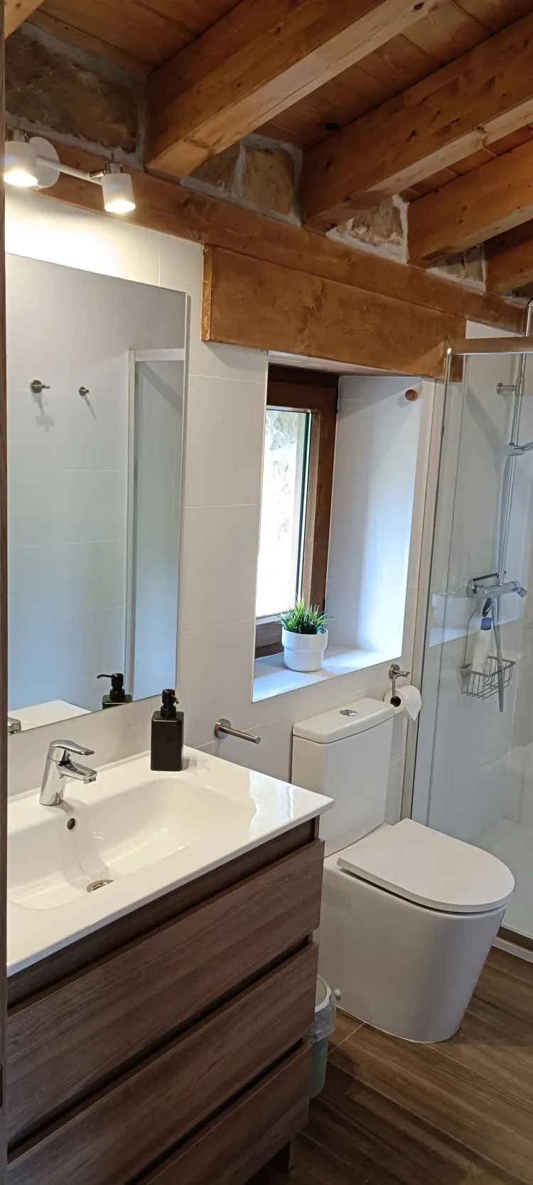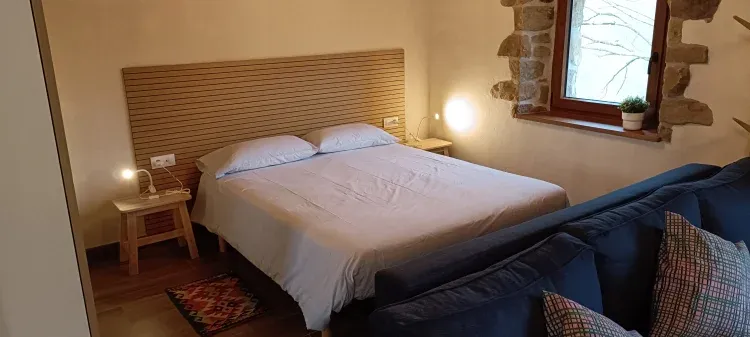 El alojamiento es un estudio en primera planta de 35 metros, totalmente diáfano, dispone de una cama de matrimonio de 1,60 x 2 y un sofá cama de 1,40 x 2 para una persona, baño y cocina completamente amueblada con frigorífico, microondas, vitrocerámica, horno y estufa de leña.