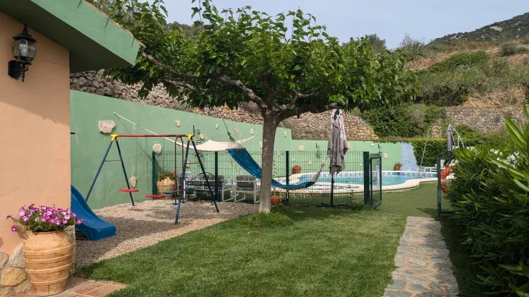 En el exterior dispone de un extenso jardín con césped, en el que se encuentra la caseta de la barbacoa y porche exterior, zona infantil con columpios y tobogán, y el recinto vallado de la piscina con jacuzzi .