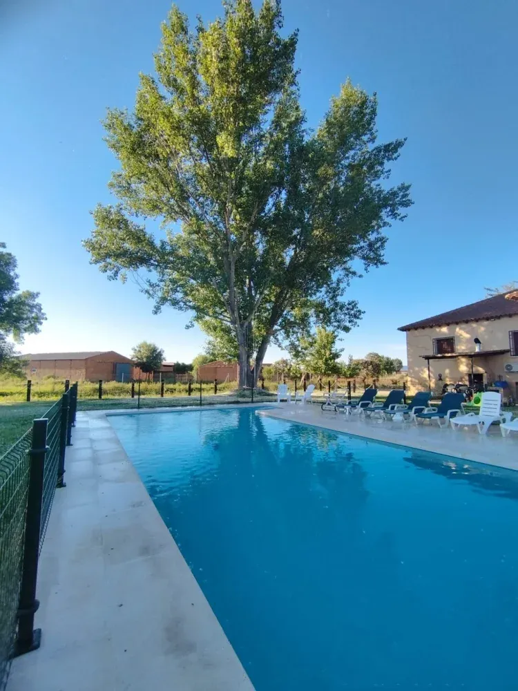 La parcela que rodea la vivienda vayada cuenta con árboles que le dan sombras en verano, frutales,fresnos y chopos y con campito de fútbol, barbacoa privada con tejado y leña gratuita disponible para los clientes, piscina de 15 metros de agua salina con tumbonas,mesas y sillas vallada para la seguridad de los más peques.