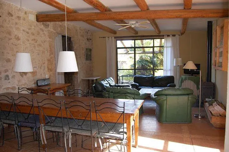 La planta baja, consta de una sala de unos 50 m2 que hace de sala de estar con chimenea y comedor cocina. Una gran cristalera da a la plaza del pueblo y otra cristalera que da al jardín. La “era” dispone de un porche para las cenas de verano, al lado de un jardín con bambúes y palmeras.
