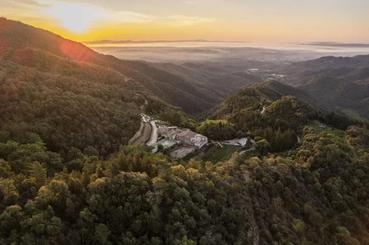 Mas Huix se encuentra en un entorno privilegiado, aislado y rodeado de montañas y bosques ofrece impresionantes vistas panorámicas de la llanura de la Selva hasta el Gironés. Está situada en un paraje de gran belleza natural a unos 560 m de altitud.