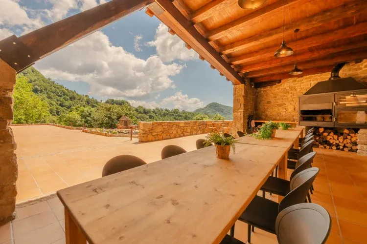 El exterior de la casa, un espacio ajardinado que se pierde con las vistas en las montañas de la sierra Milany y Santa Magdalena. Junto a la casa, hay un gran porche equipado con una mesa larga para disfrutar de comidas con todo el grupo, una cocina fría y la gran barbacoa con horno de leña. Detrás del porche encontramos el antiguo pajar, convertido en una sala de juegos equipada con un billar, tabla de ping-pong, futbolín y dardos.