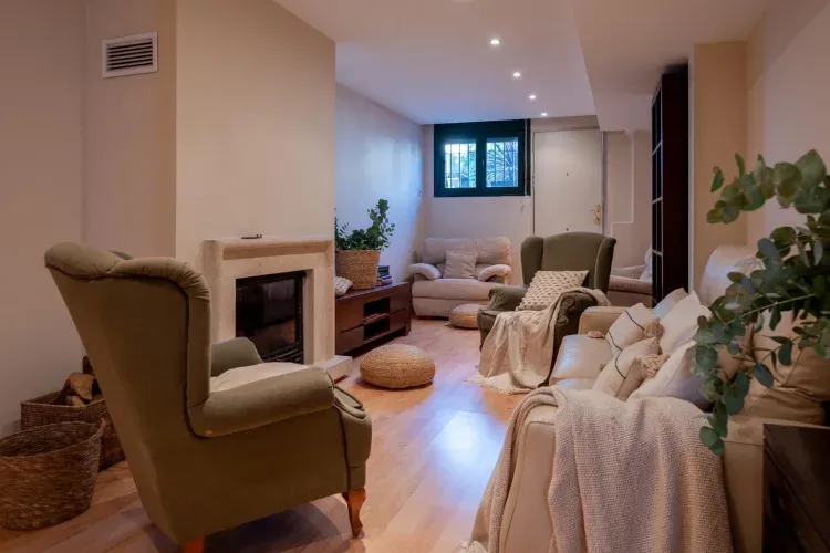 La vivienda consta de 2 salones con chimenea propia cada uno , 2 dormitorios dobles y uno triple, todos situados en la planta de arriba, con dos cuartos de baño, uno de ellos en suite en la habitación principal. En la planta principal tenemos la cocina totalmente equipada y con todos los electrodomésticos en perfecto estado, uno de los salones con gran pantalla de TV y un aseo. Y en la planta semisótano tenemos el otro salón también con chimenea y con un sofá cama de 150 cms. El salón de abajo está totalmente acondicionado para reuniones familiares, con 2 mesas plegables de 180 cms cada una, perfectas para una gran cena.