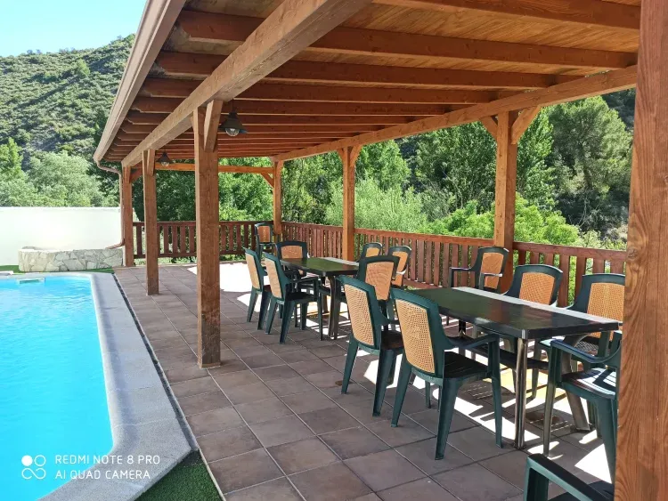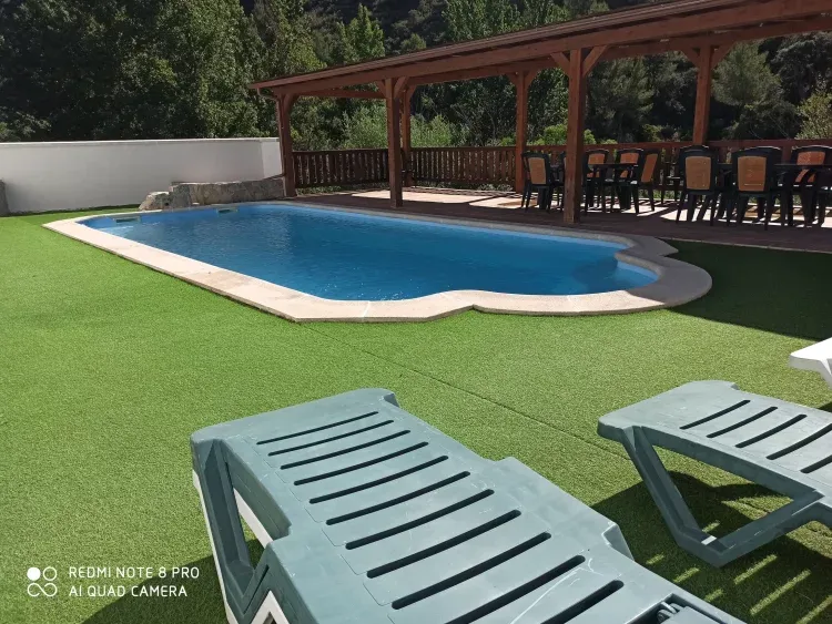 Los exteriores de la villa están vallados y protegidos por altos muros, asegurando así privacidad completa a aquellos que quieran disfrutar del tiempo excelente de Andalucía. La primera zona que encontrarás al entrar en el cortijo cuenta con una barbacoa y un cuarto de baño exterior con plato de ducha. Mientras que a mano izquierda se accede a la casa, a mano derecha una puerta te conducirá a la zona de la piscina. La impresionante piscina privada es ideal para refrescarte, y las tumbonas cercanas son la elección ideal para aprovechar al máximo de los cálidos rayos del sol. El área está coronada por una imponente pérgola de madera orientada hacia el arroyo Milano y a una impresionante y tranquila vista a decenas de pinos y olivos. Aquí podrás descansar, disfrutar de deliciosas comidas y protegerte cuando las temperaturas suben.
