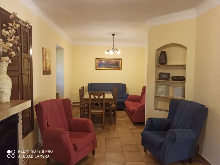 Ambas plantas de la vivienda están decoradas con mobiliario rústico que se inserta perfectamente en el ambiente, creando una atmósfera hogareña en todo el alojamiento. La planta baja de la casa presenta un espacioso salón co-medor, una cocina independiente completamente equipada con electrodomésticos modernos, y dos de los seis dormitorios de la casa. Uno de ellos cuenta con una cama de matrimonio, mientras que el otro está equipado con una cama de matrimonio y una individual. Entre las dos estancias, se encuentra un recibidor y un pasillo con dos