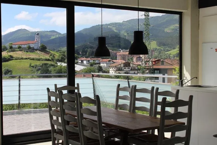 Tenemos servicio de desayunos, media pensión y pensión completa para grupos. Adaptamos menús y horarios a las necesidades del grupo. Nuestro comedor es una sala amplia con vistas hacia la Basílica de Loiola y el monte Hernio.