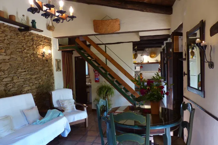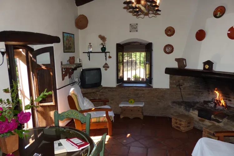 En esta casa se ha acondicionado una coqueta cocina, que está totalmente equipada (microondas, cafetera, tostador, cubiertos, etc.), un salón comedor con chimenea de piedra, TV DVD, ect y un dormitorio en el ático de la casa con capacidad para dos - tres personas (cama de matrimonio y cama individual). El sofá del salón se transforma también en una cómoda cama de matrimonio. El cuarto de baño (con ducha) tiene vistas al campo, al igual que el resto de la casa.