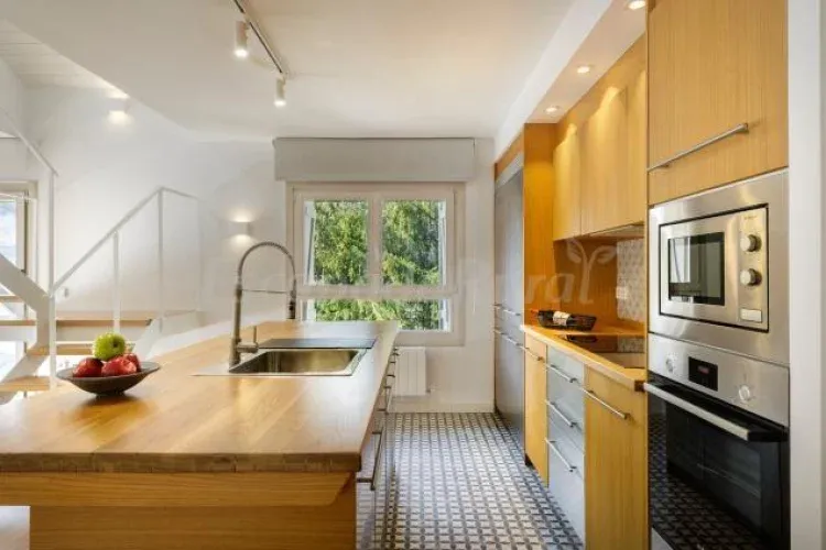 Nada más entrar tenemos la luminosa cocina, con barra de desayunos, completamente equipada para tener una estancia con todo lo necesario, cocina de inducción, horno, microondas, nevera con congelador de gran tamaño, cafetera de cápsulas, tostadora, exprimidor eléctrico, lavadora, lavavajillas y todo el menaje, cazuelas, sartenes y vajilla adecuado para cada huésped.