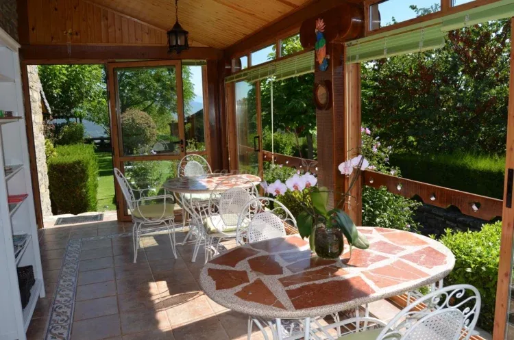 Ofrecemos también unos completos desayunos, servidos en mesa, en nuestro porche acristalado, con vistas al jardín. Es una sala de nuestra propia vivienda que compartimos con los huéspedes y que en los días frios podemos calentar con estufa de leña.