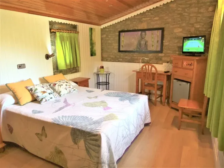 1 Habitación doble con Terraza: Tiene una cama de matrimonio de 1,50m x 2m, entrada directa desde su propia terraza exterior, baño privado, calefacción, terraza ajardinada, TV pantalla plana, ventilador, mosquiteras en ventanas y un pequeño frigorífico. No se permite fumar dentro de la habitación.