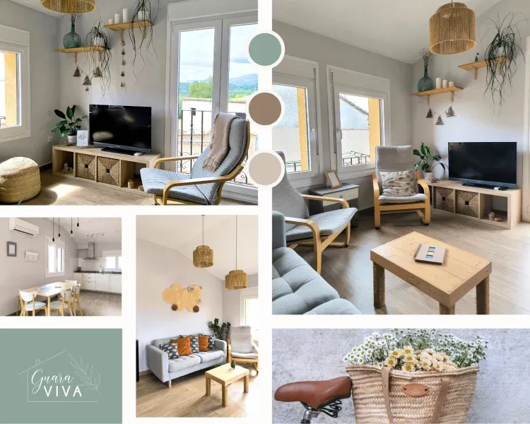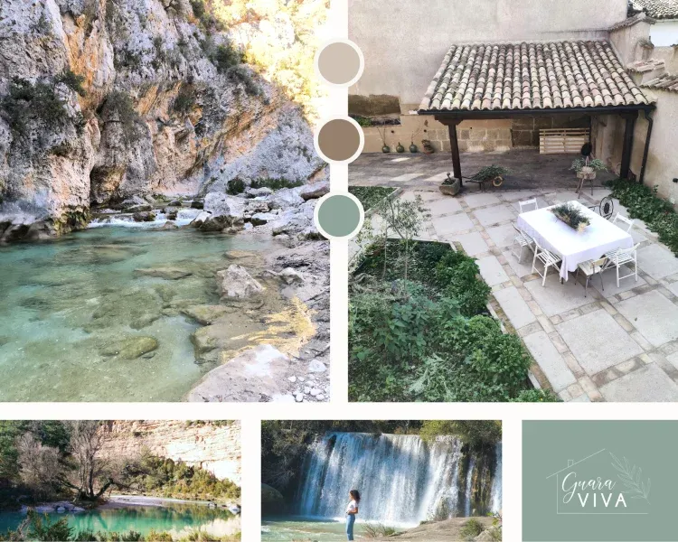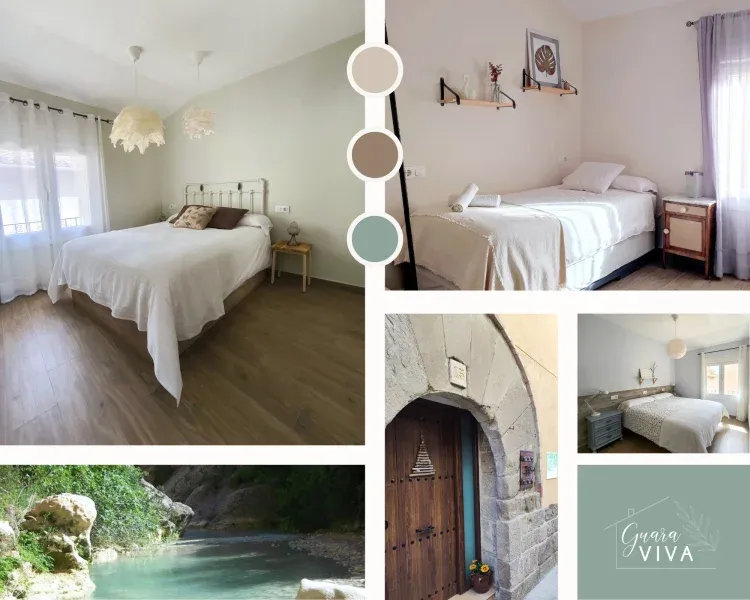 GuaraVIVA es un bonito alojamiento situado en Abiego, provincia de Huesca, tiene capacidad para 6 personas distribuidas en 2 habitación de matrimonio y 1 doble. Además dispone de cocina totalmente equipada con lavavajillas y microondas, comedor y X baños completos.