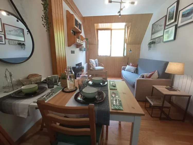 El alojamiento tiene 38m y todo lo necesario para tener una estancia cómoda y perfecta. El apartamento es de estilo rústico con paredes forradas de madera que le dan calidez.