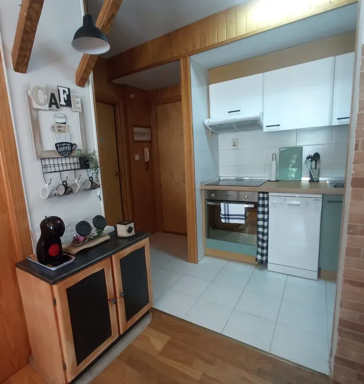 El salón-cocina es precioso con paredes forradas en madera y decoración un poquito rústica dándole un estilo de montaña. El salón tiene un sofá cama. También tiene un mueble con zona de café e infusiones y con un pequeño desayuno para que nuestros clientes se sientan como en casa.