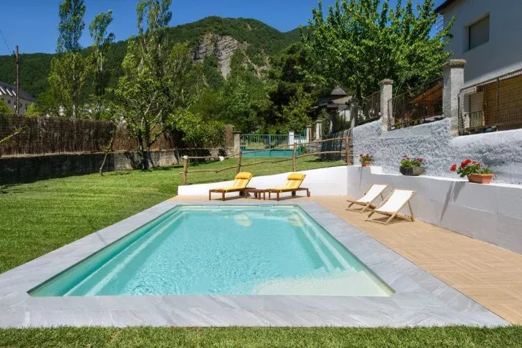 La casa se sitúa en la bonita localidad de Villanúa ,nueva a estrenar y super equipada, cuenta con piscina de 8 x 4 metros con hamacas, frente al porche exterior de 35 metros cuadrados con una zona chill out con amplio sofá y equipada con una magnifica barbacoa , horno de leña, un mesa extra grande.