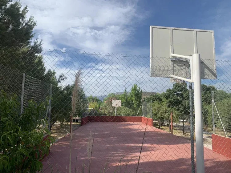 El exterior consta de Barbacoa, Zona de juegos para peques, Pista petanca, Pista de Baloncesto, Jardines, Piscina, Pequeño corral.