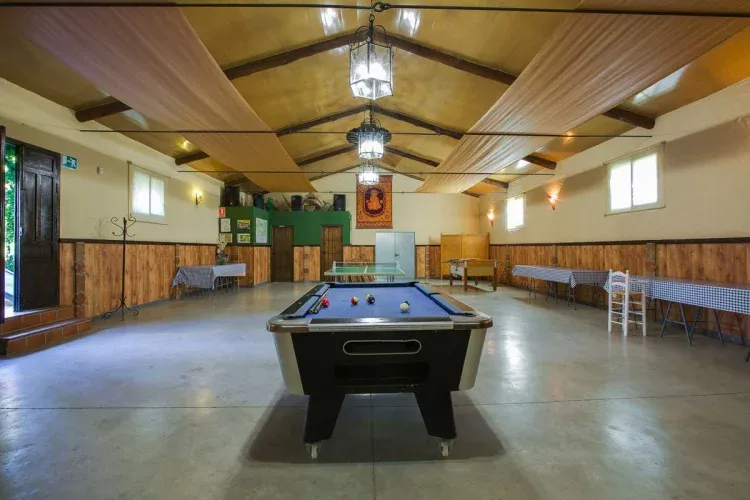 LA CASA PRINCIPAL con 7 habitaciones, tres baños, salón y cocina, *habitación y baño adaptado para personas con movilidad reducida, da paso al PATIO CENTRAL cerrado al exterior asegurando su privacidad, piscina con medidas de seguridad para los peques, Zona de juegos infantil, SALÓN SOCIAL (150m) para disfrutar con tu familia o grupo de amistades de grandes momentos de diversión, barra americana, 2 aseos, futbolin, billar, pinpon, dardos, cocina para grandes grupos, TVsmart, wiffi, equipo de musica, chimenea.