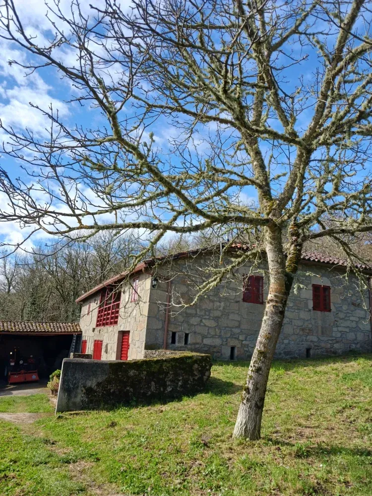 Está situada en una tranquila aldea, rodeada de una finca de 5000 m2 con castaños y robles centenarios. Ideal para familias con niños, pasear y desconectar.