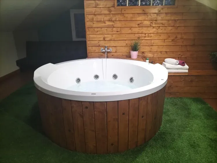 Bañera hidromasaje enorme redonda para dos personas con cromoterapia.