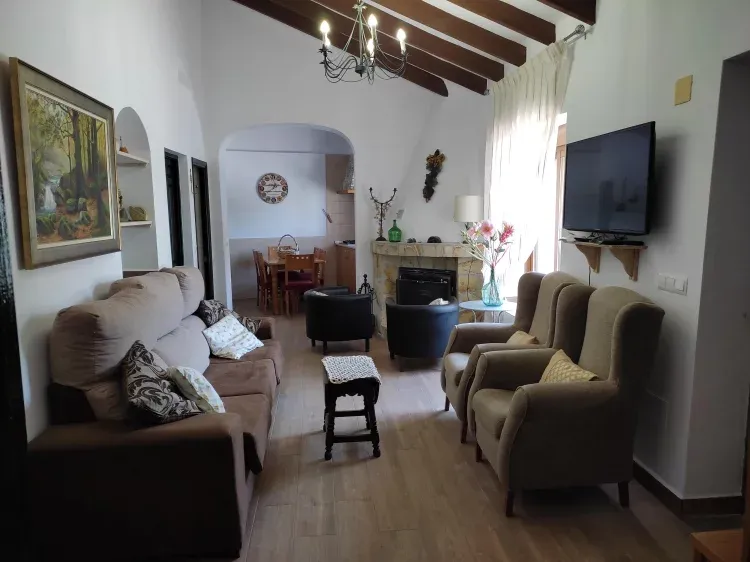 Salón con chimenea y tv 50" smart con 135 canales en cinco idiomas. Cocina, con despensa, totalmente equipada con horno, lavavajillas, frigorífico, congelador tipo arcón y todos los utensilios necesarios.