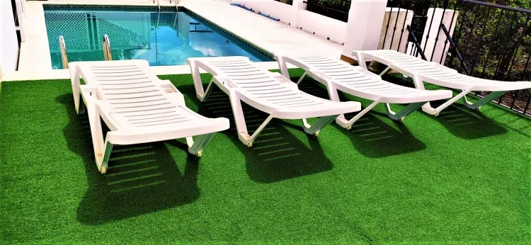 Además consta de comedor con chimenea, televisión, cocina totalmente equipada, piscina privada con césped artificial y amplia terraza.