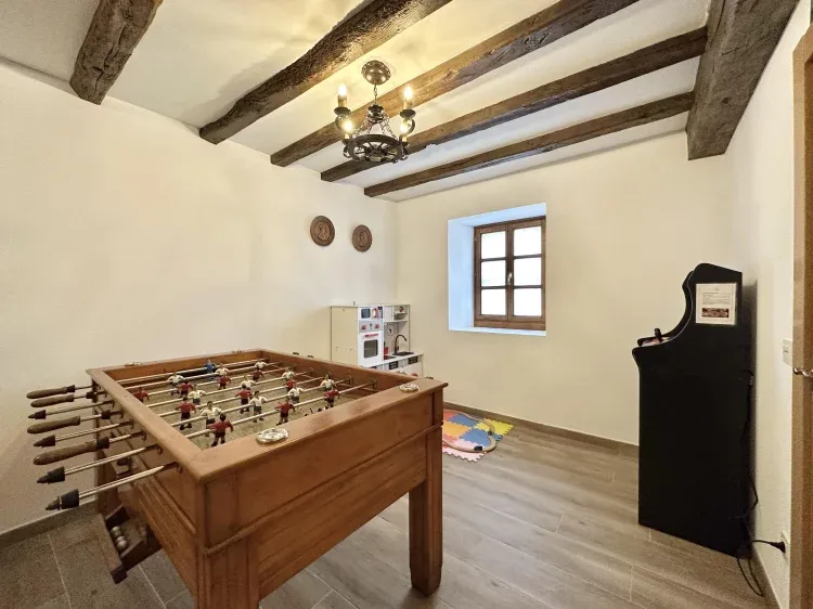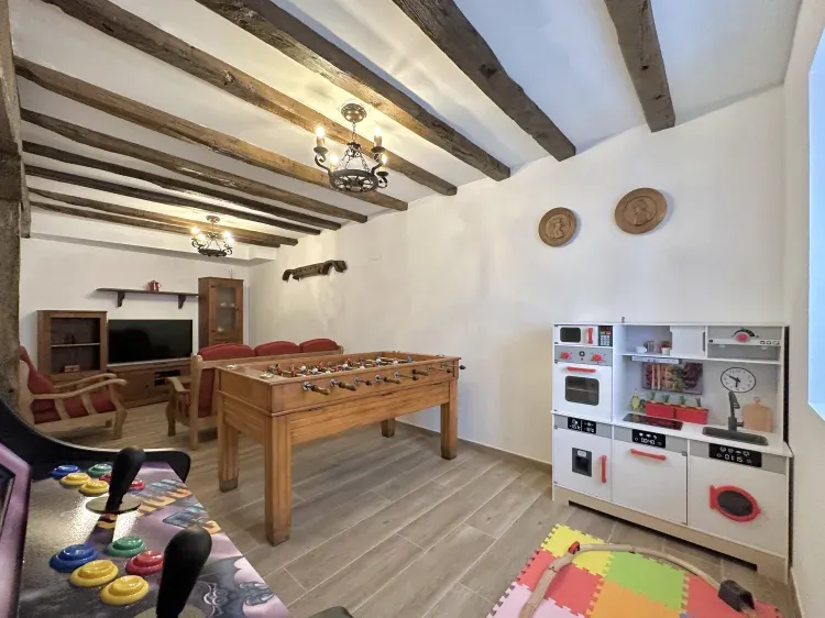 -Planta baja: entrada, garaje para una plaza (con mesa de ping pong y máquina de dardos) y sala de juegos (futbolín, recreativa de videojuegos, juegos infantiles, TV de 50”, mesita y sofás).