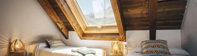 Ático, también llamado bajo techo. Rústico, el maderaje de la cubierta, a la vista.